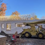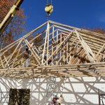 Once the walls were complete, the roof started, first with the trusses. Dave came in to operate the crane, lifting the trusses into place, starting from the east side all the way to the garage end in the west. Joe and James lined them up on the marks Dennis and Joe has inscribed on the top of the walls. They also had to be certain that the truss ends were equal on each side of the house. Once done, Joe and James nailed them in. As each truss was added, Dennis set up a 2 x 8 across the middle to tack them at precisely 24 inches apart centre to centre. Rather hair raising to see Dennis walking on a narrow board through webs of wood, nine and half feet above the floor. Didn’t bother him at all. I found it even crazier when both Dennis and Joe were up in the truss ends that will be the roof of the porch behind the garage as they dangled at least fifteen feet over rocky ground. I have limits they don’t even blink at.