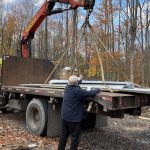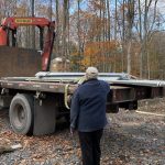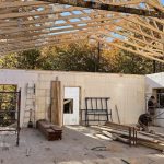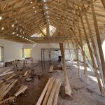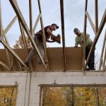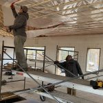 Once the trusses were up, it was time to put up the sheathing and the underlay, readying the roof for the steel. 95 4×8 sheets of half inch plywood cover the roof span, almost 3000 sq. ft. The look of the house has shifted. It has led a number of people to perceive it as a big house. So much so that Joe, who now knows the building well, refers to it as “the big little house”. The sheathing was done over a few days given an intervening rain day. With half of it on, I expected there would be some dry spots on the floor after the rain. Not so. Many puddles were left after a bad night of precipitation. It was only after the sheathing was completed and the underlay added, that the house became dry for good.