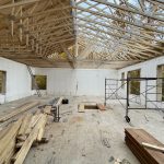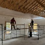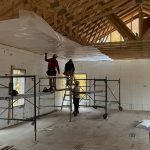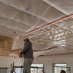 Two types of underlay were used. Heavy duty ice and water guard were added to the first 6 feet from the eaves on both sides of the roof. On the south east face, this was increased to 13.5 feet as this will be the area for the planned solar panels. This is the peel and stick membrane that seals off any fastener penetrating the sheathing. The rest of the roof has a thinner underlay that is waterproof and breathable. It will serve to remove the condensation that accumulates under the steel. James and Nikki scampered over the roof laying and stapling it down. Once up, the house became “waterproof” and this felt great. It also permitted the work on inside. We started putting up the vapour barrier and strapping to eventually receive the insulation and drywall.