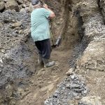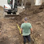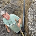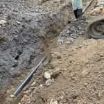 In the meantime, Dave came by to move some earth around, build up the slope on the west side of the house, and dig the trench for the electrical hookup. Robbie had a load of sand delivered to cover the bottom of the trench and protect the conduit for the wire. As might well be expected, Dennis was in the hole laying down and gluing the various pieces of pipe. After each link was done, Dave covered the pipe with more sand. Dennis lay a caution tape on top before the back fill was added so that anyone digging in the future would be alerted to the wire being there. The house and pole ends were left open so the wire could be pushed though. Job was done with another bonus lawn ornament.