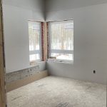 Mid-February was rather mild, and provided a good opportunity to do the insulation. This was done while the main floor drywall was completed. The house was then cosily warmed by the single heater in the basement.