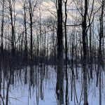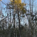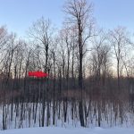 As March approaches, I am a less skittish about leaving late. Working on the garage insulation and steps took Dennis and me past the 3 pm, pre-rush hour return I’ve done during the deep winter. I had to wait till past 5 pm to leave to be on the other side of rush hour. The later sunset and mild weather permitted me some time to walk in the back yard after Dennis left for the day. The relative warmth made the snow curl precariously off the roof while simultaneously making the snow more dense and easy to snowshoe. I made it towards the back of the property and discovered a solitary, very large eastern white pine which likely sits on the eastern boundary. A spectacular specimen that I was able to keep in sight all the way back to the house, and then spot through the living room window. It is about 3/4 of the way to the back of the property, and provides a sense of the depth of the land.