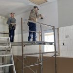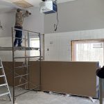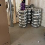 Michel and Denis Dicaire are two short and wiry individuals with a long work background. They still zip along climbing scaffolding lifting sheets and screwing them in. Even though the garage has a 12 ft ceiling, with the help of Dennis’s drywall lift, it was covered in a short day. Shifting the scaffolding around was the clumsy part, as we had to negotiate the garage door openers and rails. Dennis watched all this with care and we avoided any mishaps. In two days and change, the garage was complete and ready to receive the stuff in storage. The best part: the brothers are up for doing the walls in the basement once the HVAC has been installed and inspected.