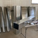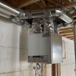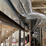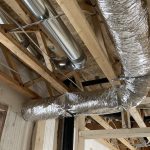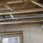 While the drywall was going up in the garage, Neil and John, the tinsmith, began work on the HVAC. First, the ducts went up: main trunks for heat and cold return, as well as the separate lines spread throughout the house. Given the house design, the duct layout is fairly straightforward. Nonetheless, the work took about 4 days with the last tasks, connecting the hot plenum and cold return to the air handler and boring holes through the concrete for the HRV, happening after work on the heating equipment started.