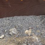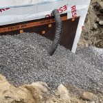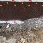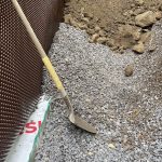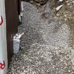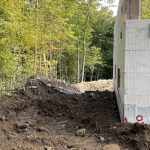 This is rough work, with Dennis doing the lion’s share. Shovel dumped gravel in the hole and I shovelled it on the tile drain. I took a photo and Stephane then dumped the backfill with Dennis scrambling to get large rocks off the tile. No easy task. This continued from the front, to the east side and finally the back. The west side was already covered. With an attached garage with no basement, the tile is placed on the wall adjoining the house. There is tile around the garage, but code doesn’t require it. Err on the side of caution. [More on this later.]