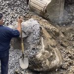 With yet more effort and dirt removal, Stephane got it to stir a little, but getting out to the surface was another thing altogether. One more time, into the breach, literally and figuratively, steps Dennis. In tandem with the shovel, Dennis placed rocks and dirt under the boulder as Stephane did his best to keep it raised as much as possible. The video below catches the suspense.