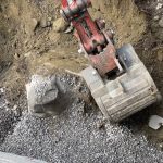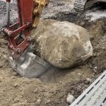 Later in the afternoon, we confronted the beast. In the front of the house, on the edge of the foundation hole there was a boulder that could not be moved. At first, we thought it could be left in place, but ultimately, it appeared that it might be a risk to the foundation, so it had to be removed. Ha-ha. The battle ensued, and in the 45 minutes, the boulder was winning. Stephane dug around, and it kept getting bigger and bigger, and still refused to budge.
