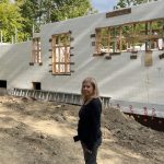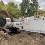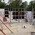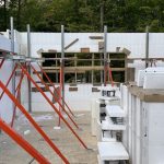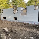 Little more difficult is the top of the walls — and this is an instance where plans and reality don’t fully match up. In going up to 22 inches in the bottom from 20, this meant that the space above the window was reduced from 12 inches to 10. This does not leave enough room for the rebar stirrups to reinforce the lintels as the engineer requires. The walls have to be raised. Going up a whole 16 inch brick makes no sense. Most sensible way is to go up about 3 or 4 inches with extensions that the block manufacture produces. Robbie phoned Emard Brothers to see if they had these in stock. They said they could order, but likely cheaper to just trim the top and bottom of regular blocks. They told Robbie he could scour their stock for any remainders they would discount. Robbie also said we could use the leftover partial blocks. Upshot, the problem is resolved with the walls, planned at 9 ft, now to be about 9″ 5″ or 9′ 6″. [ 2 inches rise on the bottom and the 3- 4 inches with the extensions on top.] It also means the vaulted ceiling peak will be over 13 feet instead of 12′ 9″. An unanticipated bonus.